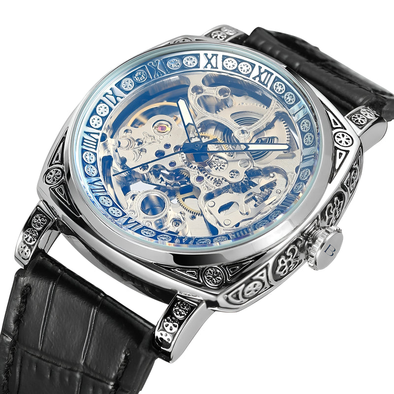 Meet the Exoskeleton Silver Watch, The black strap version .